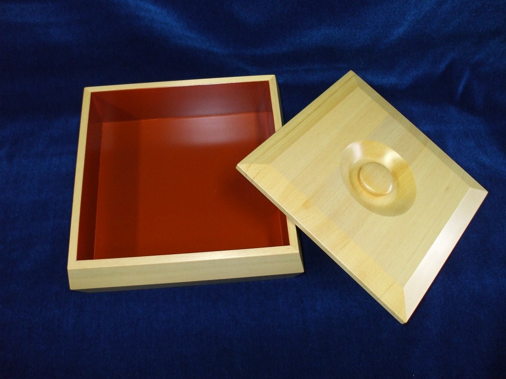 左:中の木目まで綺麗な無地の菓子器 右:高級感溢れる中朱塗りの菓子器
