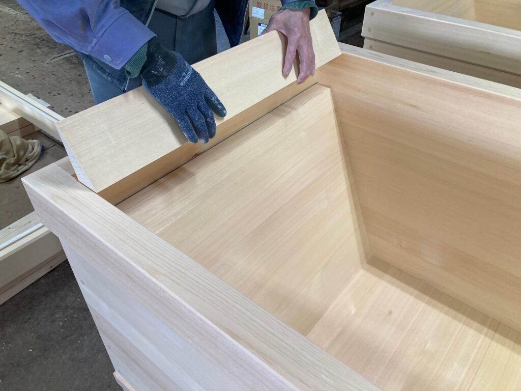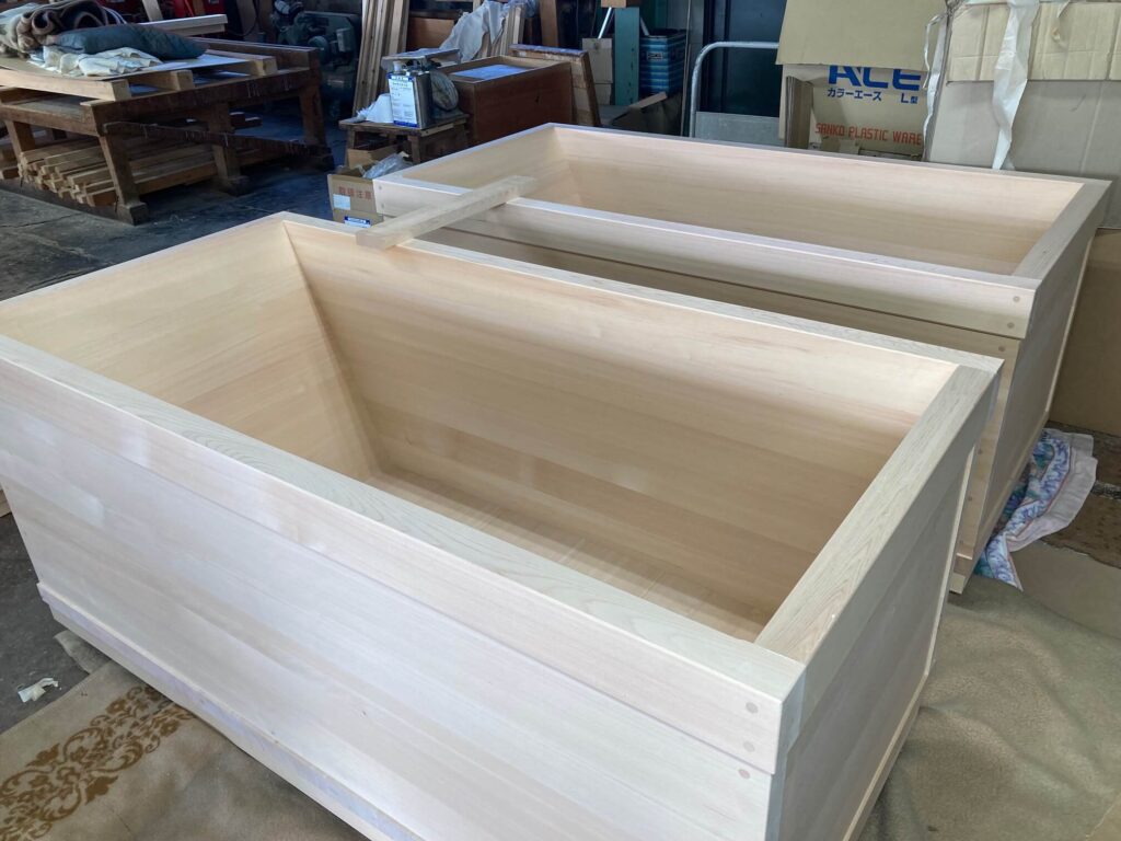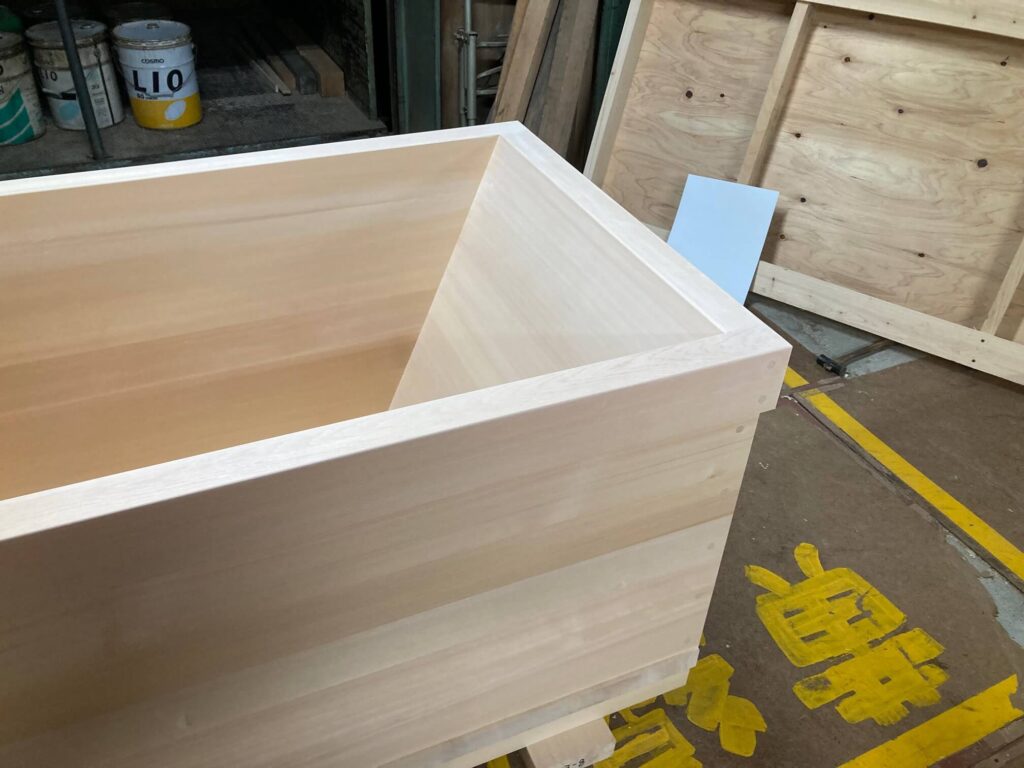 リゾートホテルに設置される大型の天然木曽檜の柾板を使った高級風呂の注文を受