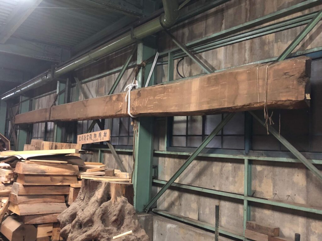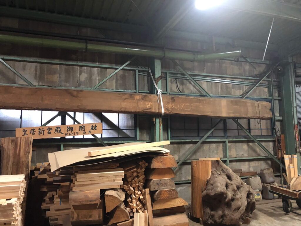 古い建物にそれとなく置いてあります根株は樹齢1000年を超える木曽檜の根株と当社が皇居新宮殿正殿の松の間に納品させて頂きました長押材のかたわれになります。いずれも当社の宝物です。