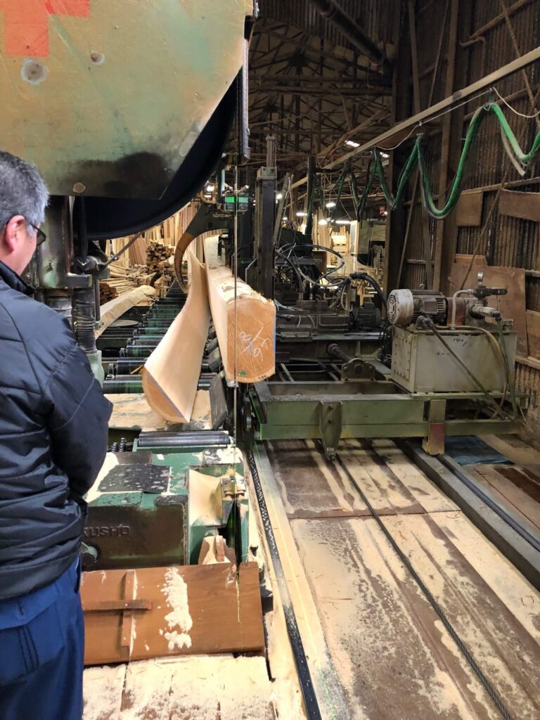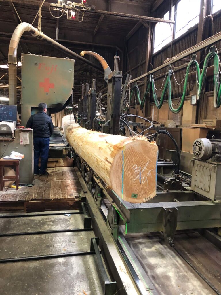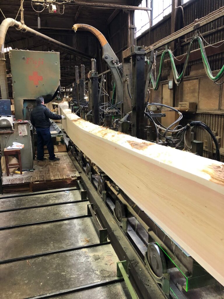 牛嶋神社様鳥居用の島木を製材させて頂きました。当社製材機は長さ15m迄対応可能ですが、今回は8mの長さの丸太を製材させて頂きました。これだけの長さとなりますと、末に節が出易いのですが、幸い大きな節も出ず綺麗な理想的な曲がりの島木が取れました。