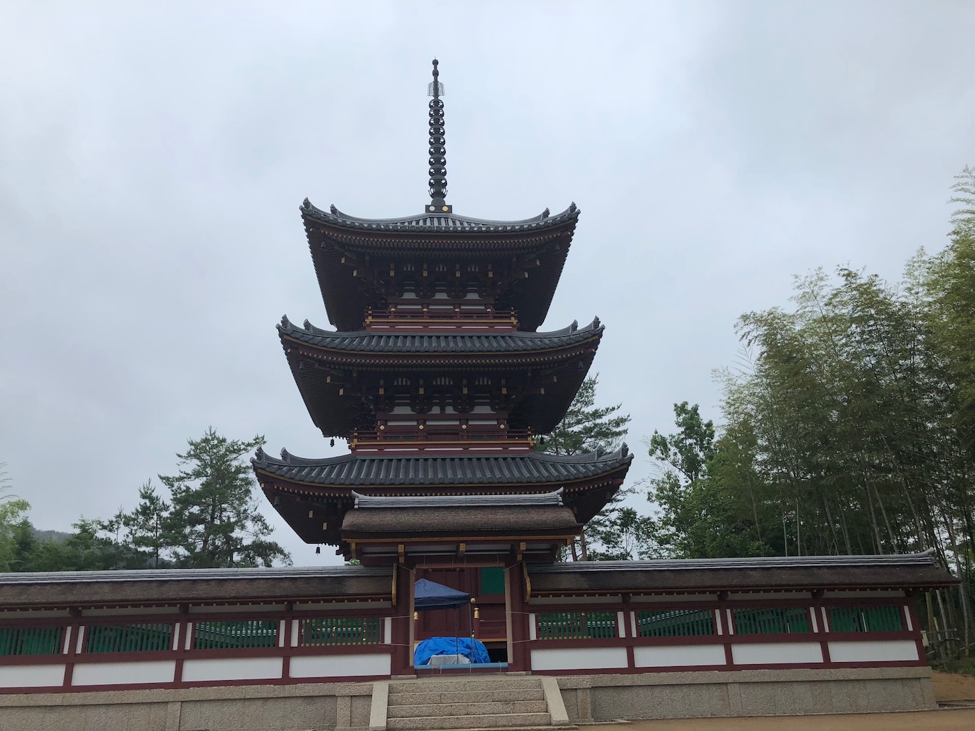 おかきやおせんべいで東京丸の内にも支店を開いている播磨屋本店様の三重ノ塔用材納材。柱は全て天然木曽檜を使用。朱色に塗りをかけた為、小節仕様でしたが、茅負、木負や長押材等は無節、上小材をかなり奢らせて頂きました。設計施工は(有)播磨社寺工務店様です。屋根瓦も奈良の山本様が担当し、関係会社全て超一流の業者と言う100年先の国宝級の塔です。
